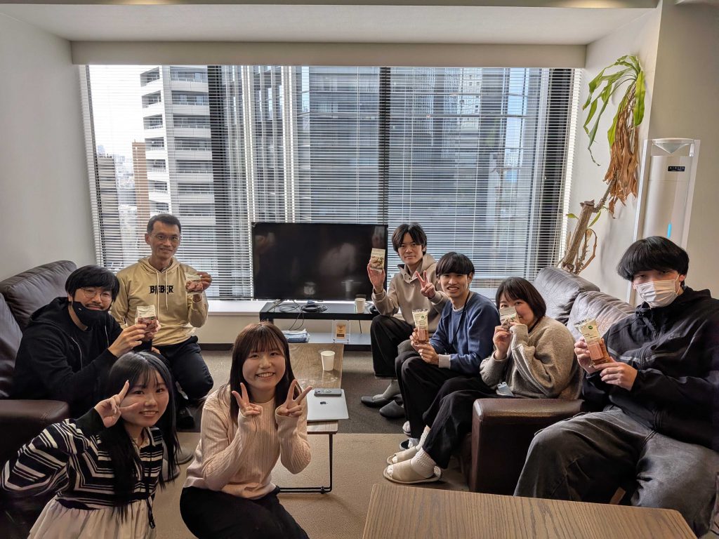 肩肘張らず、すぐに会社に馴染んでもらいたいという想いから、リラックスした雰囲気で交流できるこの企画。入社式でも祝辞を述べた新卒3年目の政岩君イチオシである宮崎県の「丸岡餃子」を300個お取り寄せして食べました!笑