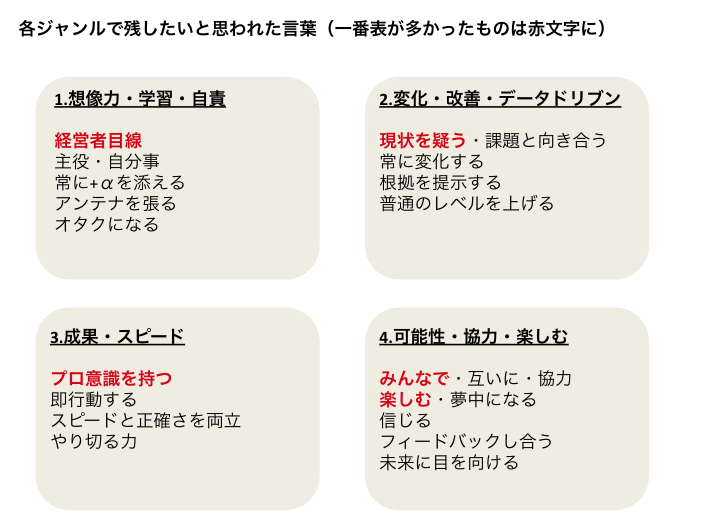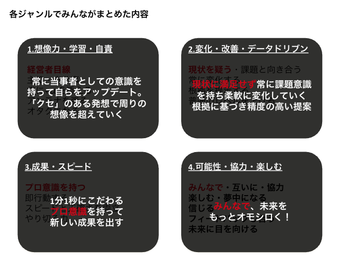 その結果、バリューは大きく以下4つのジャンルに分けられ、各ジャンルの中で大事にしたいキーワードを出し合いました。