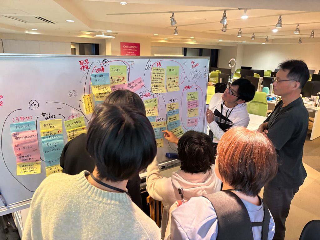個人ワークの後、出てきた言葉をすべてホワイトボードに貼り出し、似ているもの・近い意味のものを、全員でディスカッションしながら分類分けしていきました。